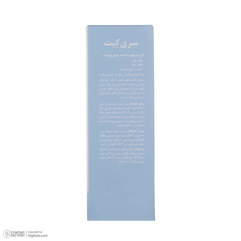 همانطور که میدانید فعالیتهای فیزیکی روزانه باعث میشود که کف پا به ویژه پاشنهها مستعد خشکی و ترک شوند. ترکهای عمیق مراقبت نشده در کف پا علاوه بر ظاهر ناخوشایند، میتوانند عفونی شده و این عفونت به درون زخم گسترش یابد. به همین خاطر لازم است از یک کرم پا مناسب استفاده نمایید تا از مشکلات بعدی نیز پیشگیری کنید. در این میان کرم مرطوب کننده پا سری کیت با مجموعه ای از عوامل لایه بردار و مرطوب کننده قوی علاوه بر حذف سلولهای پوستی مرده و خشک، زبرترین پاها را نرم و لطیف میکند. همچنین برای لطافت بخشی به سایر نواحی زبر و خشک نظیر زانو، آرنج و دست نیز مناسب است. این محصول به علت عدم استفاده از اوره، برای افراد دیابتیک نیز قابل استفاده است.