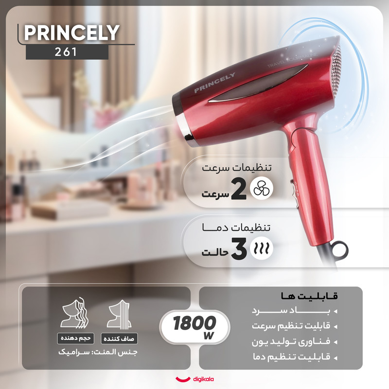 سشوار خانگی پرنسلی مدل 261، موتور DC با توان مصرفی 1800 وات، دارای قابلیت باد سرد و فناوری تولید یون، دارای حلقه آویختن، با حالت صافکننده و حجمدهنده، وزن 200 گرم، تنظیم حرارت 3 حالته و کنترل سرعت 2 حالته، به همراه 1 عدد سری متمرکزکننده پهن