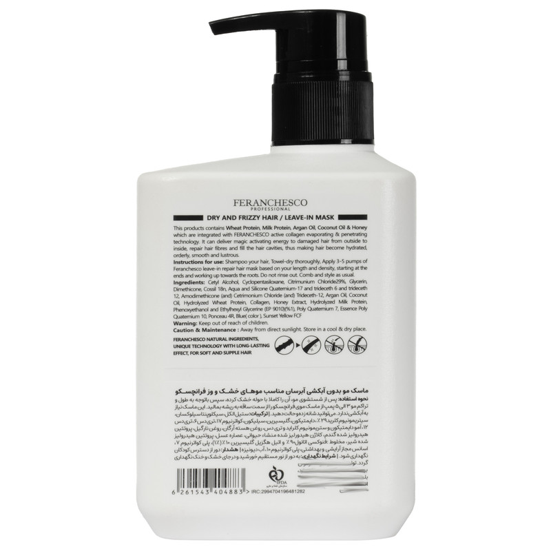 ماسک مو بدون آبکشی خشک و وز فرانچسکو محصولی از برند ایتالیایی فرانچسکو است که برای موهای خشک، وز و مجعد فرموله شده است. این ماسک مو با استفاده از مواد طبیعی و مغذی موها را آبرسانی و تغذیه میکند و به آنها درخشش و طراوت میبخشد. این ماسک مو بعد از حمام و قبل از سشوار کشیدن استفاده میشود و نیازی به آبکشی ندارد. این محصول با توجه به بدون سولفات، بدون پارابن و مواد صابونی بودن مناسب برای انواع موهای کراتینه و رنگ شده میباشد. این ماسک مو حاوی مواد مغذی مانند عسل، روغن آرگان، روغن نارگیل، کراتین هیدرولیز شده و پروتئین گندم است که موها را آبرسانی و تغذیه میکند، خشکی و وز شدن آنها را از بین میبرد، آنها را نرم و صاف میکند و به آنها درخشش و طراوت میبخشد. در ادامه به خواص این مواد مغذی میپردازیم. عسل یک مرطوب کننده طبیعی است که به حفظ رطوبت موها کمک میکند و از خشکی و وز شدن آنها جلوگیری میکند. روغن نارگیل یک نرم کننده طبیعی است که موها را نرم و صاف میکند و از موخوره جلوگیری میکند. کراتین پروتئینی است که به طور طبیعی در موها وجود دارد و به آنها استحکام و انعطافپذیری میبخشد. کراتین هیدرولیز شده به موها نفوذ میکند و آنها را از داخل ترمیم میکند. پروتئین گندم موها را آبرسانی و تغذیه میکند و به آنها درخشش و طراوت میبخشد. شیر سرشار از ویتامین ها و مواد معدنی است که موها را تغذیه و تقویت میکند و به آنها درخشش و طراوت میبخشد. روغن آرگان سرشار از ویتامین E و اسیدهای چرب ضروری است که موها را تغذیه و تقویت میکند و به آنها درخشش و انعطافپذیری میبخشد.