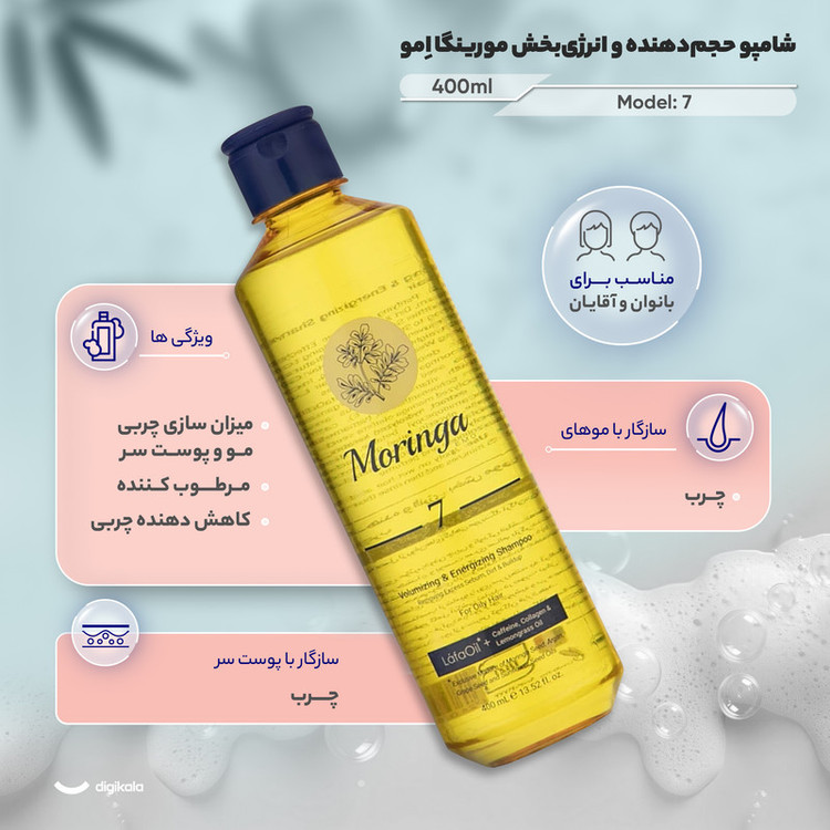 سایر توضیحات : پاکسازی موثر منافذ پوست سر و کنترل چربی اضافه آن/ ترمیم تارهای مو و بهبود ضخامت و حجم آنها/ تقویت فولیکولهای مو و جلوگیری از ریزش مو/ حفظ رطوبت پوست سر و تارهای مو/ جلوگيری از آسيبهای ناشی از نور خورشید و آلودگیهای محیطی.