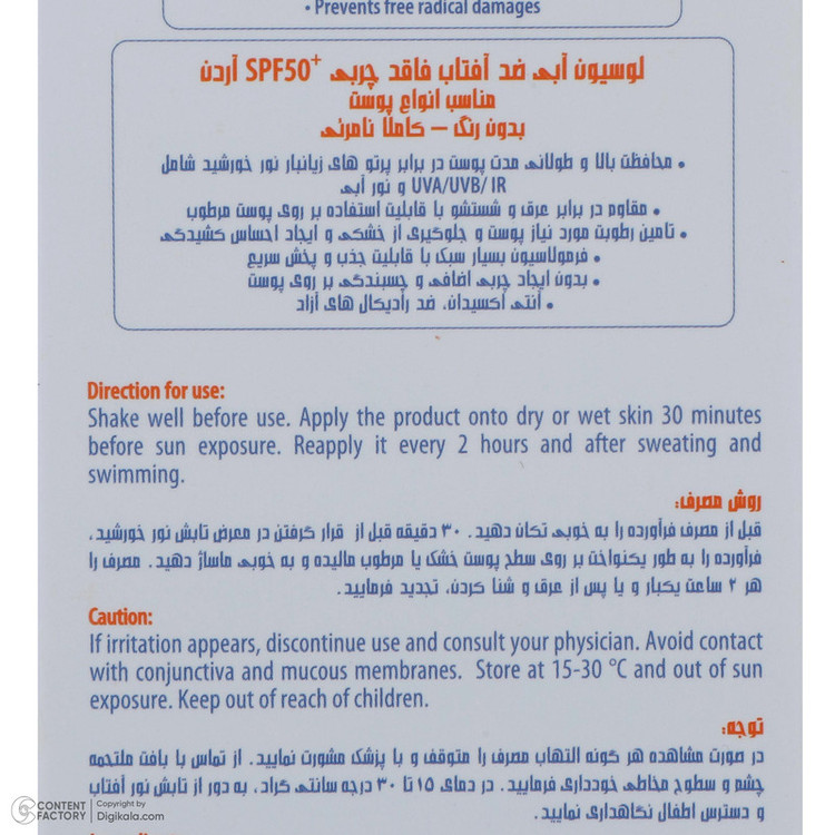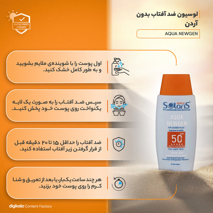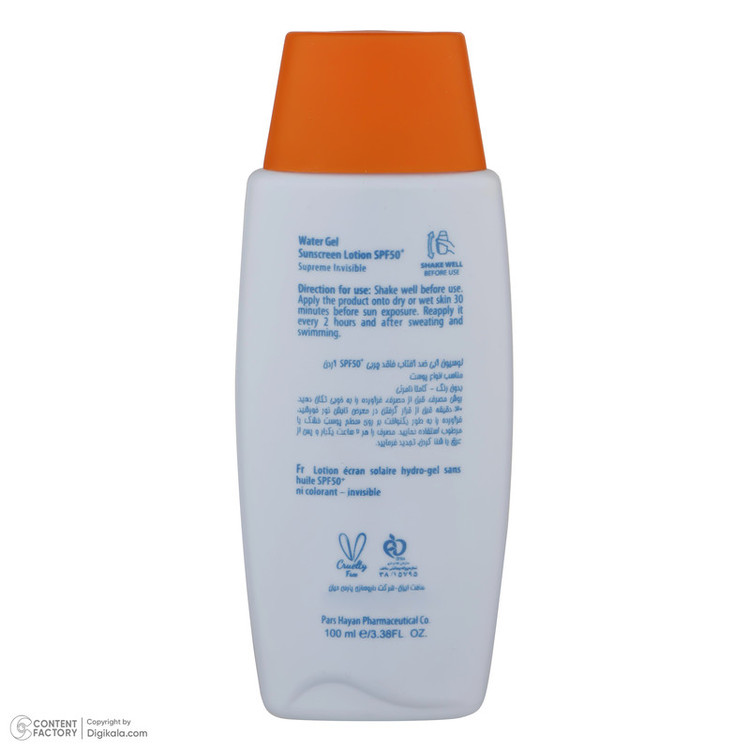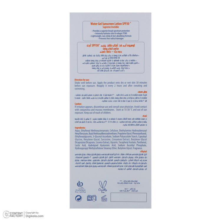 ضد آب , محافظت کننده در برابر اشعه UVA , محافظت کننده در برابر اشعه UVB , فاقد پارابن , فاقد سیلیکون