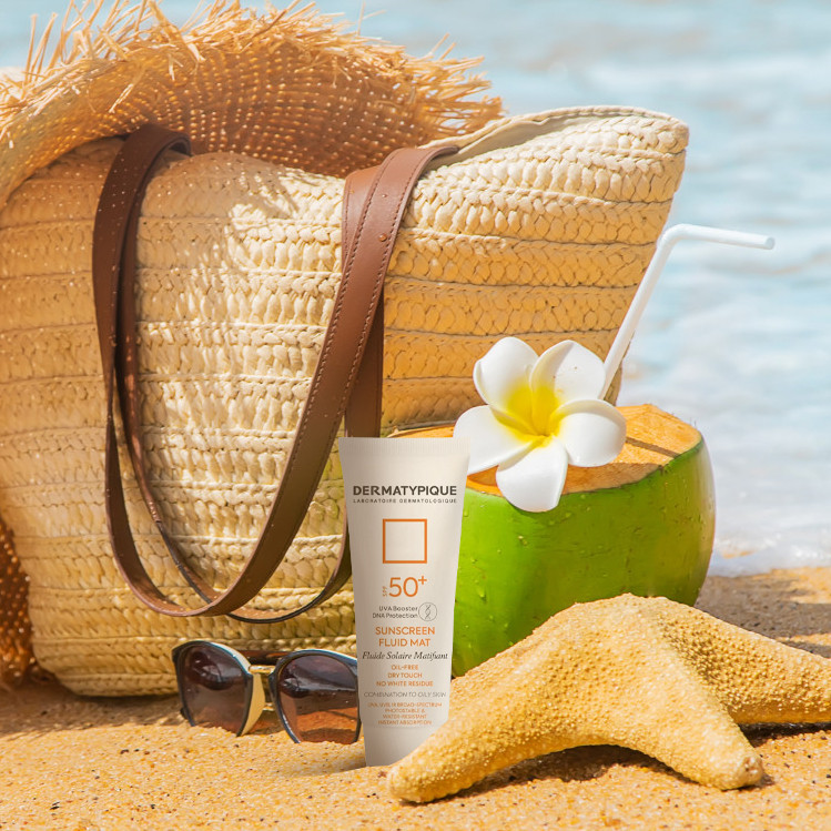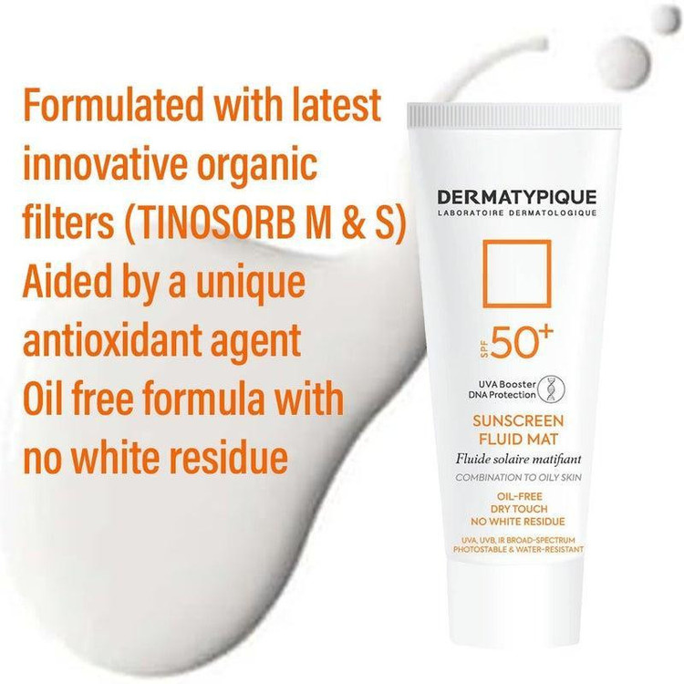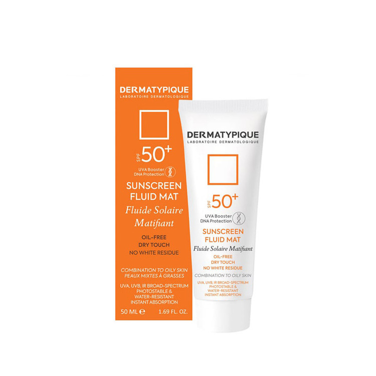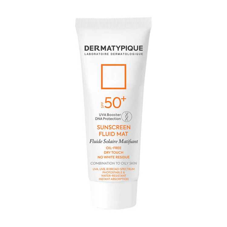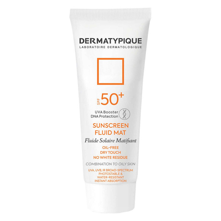 فلوئید ضدآفتاب بی‌رنگ درماتیپیک SPF50 مدل Fluid mat، مناسب پوست‌های چرب و مختلط، حجم 40 میلی‌لیتر